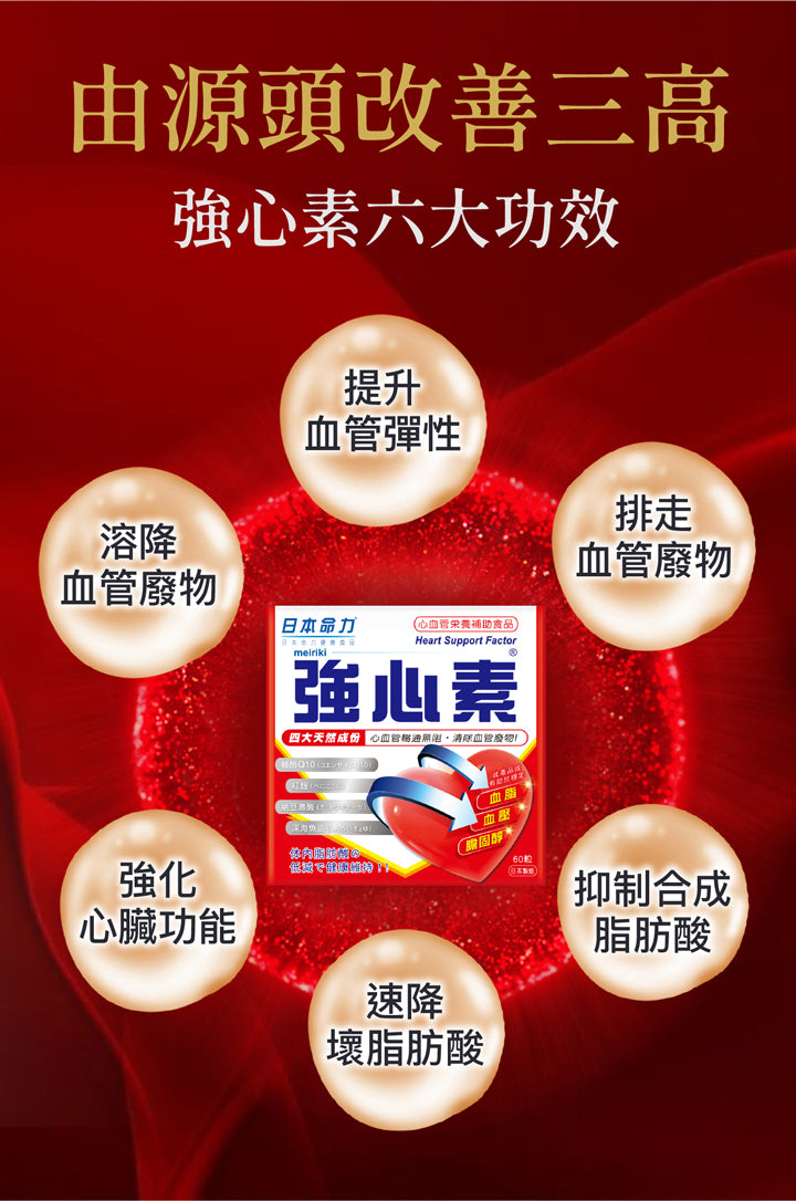 - 「強心素」從源頭清除血管垃圾﹐溶解血管黏稠物並提升血管彈性,使血液循環暢通無阻,大大提升心腦血管健康。結合不同天然元素,能同時達到強心、通血、降醇及衡脂之四大功效。